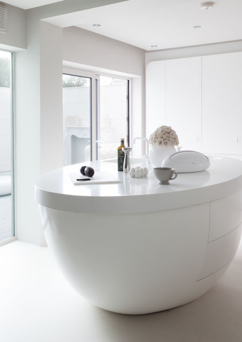 The brief was to create a light, bright and open-plan space with a minimalist aesthetic. The design team collaborated with Meg to develop the concept for the egg-shaped island which was constructed from an arched timber frame wrapped in resin creating a sculptural focal point in the open-plan living space. The Venice Beach style aesthetic developed organically off the back of the island design and pale grey concrete floors and white Corian worktops were installed to complete the clean and modern scheme.